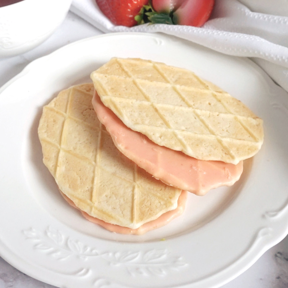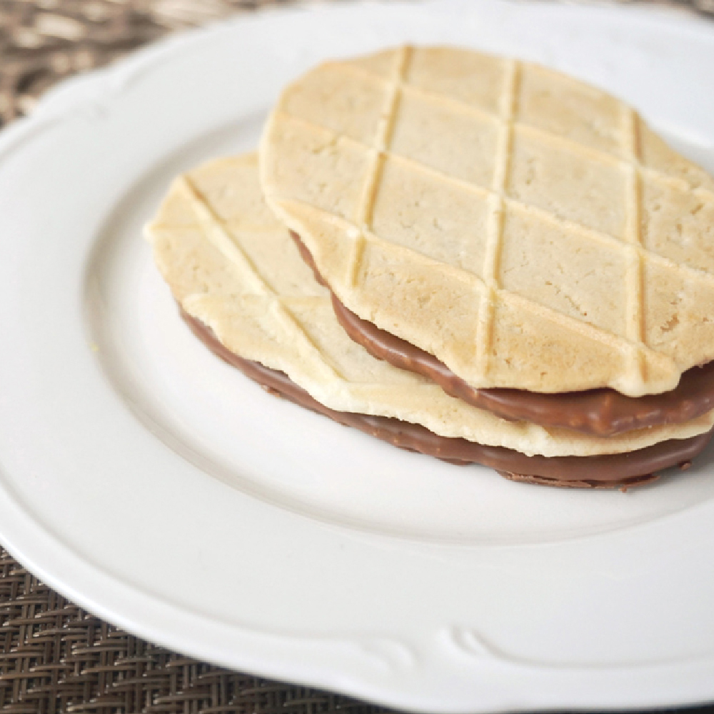 鬆餅形狀的餅乾片酥脆可口,搭配香醇滑順巧克力內餡