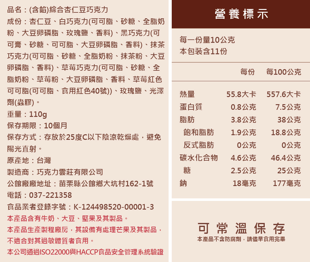 綜合4口味:白巧克力/70%玫瑰鹽/抹茶/草莓